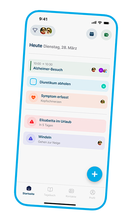 Planen und organisieren Sie Termine, Aktivitäten und tägliche Pflegeaufgaben ganz einfach. Behalten Sie wichtige Termine im Auge und sorgen Sie für einen reibungslosen Ablauf der Pflege Ihrer Angehörigen – egal, wo Sie sich befinden.